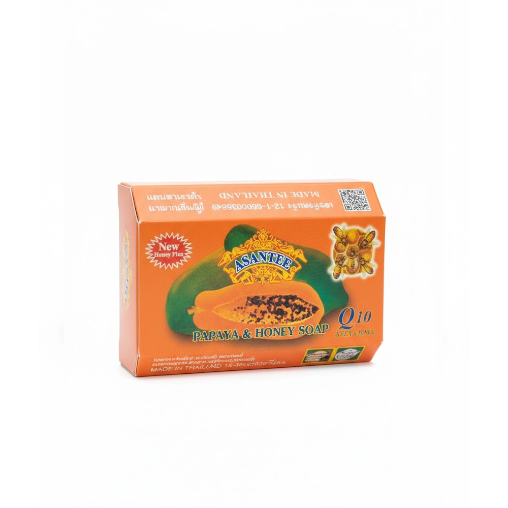Asantee Papaya & Honey Soap is a Thai herbal bar soap designed to brighten, exfoliate, and nourish the skin using natural enzymes and antioxidants. It is formulated for both face and body use to target uneven skin tone, acne, and signs of aging.