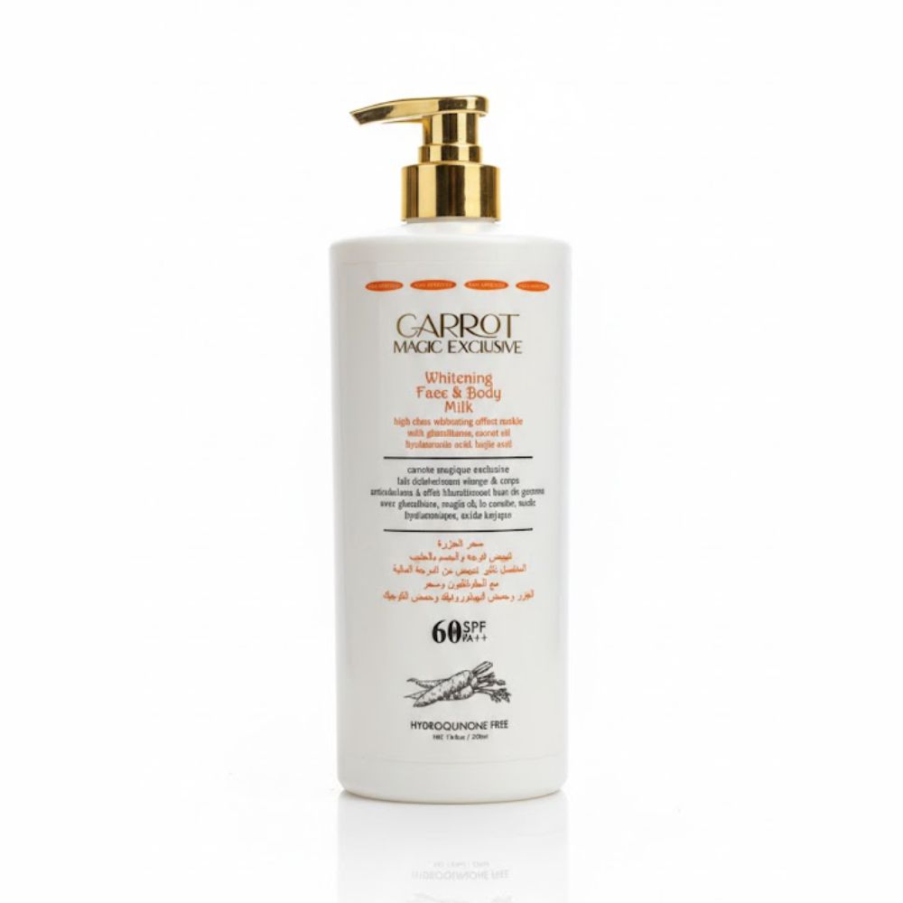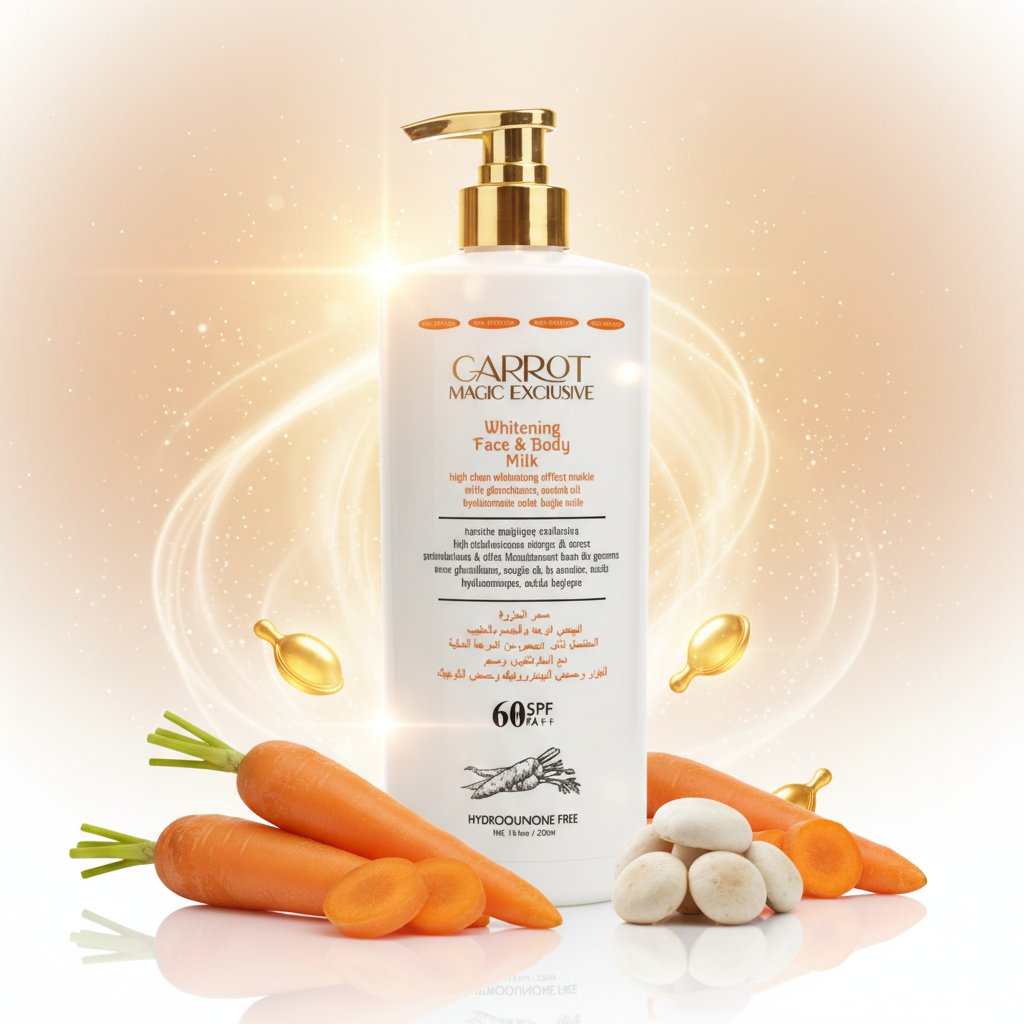 Carrot Magic Exclusive Whitening Face & Body Milk, a skincare lotion formulated to brighten the complexion and address skin discoloration.