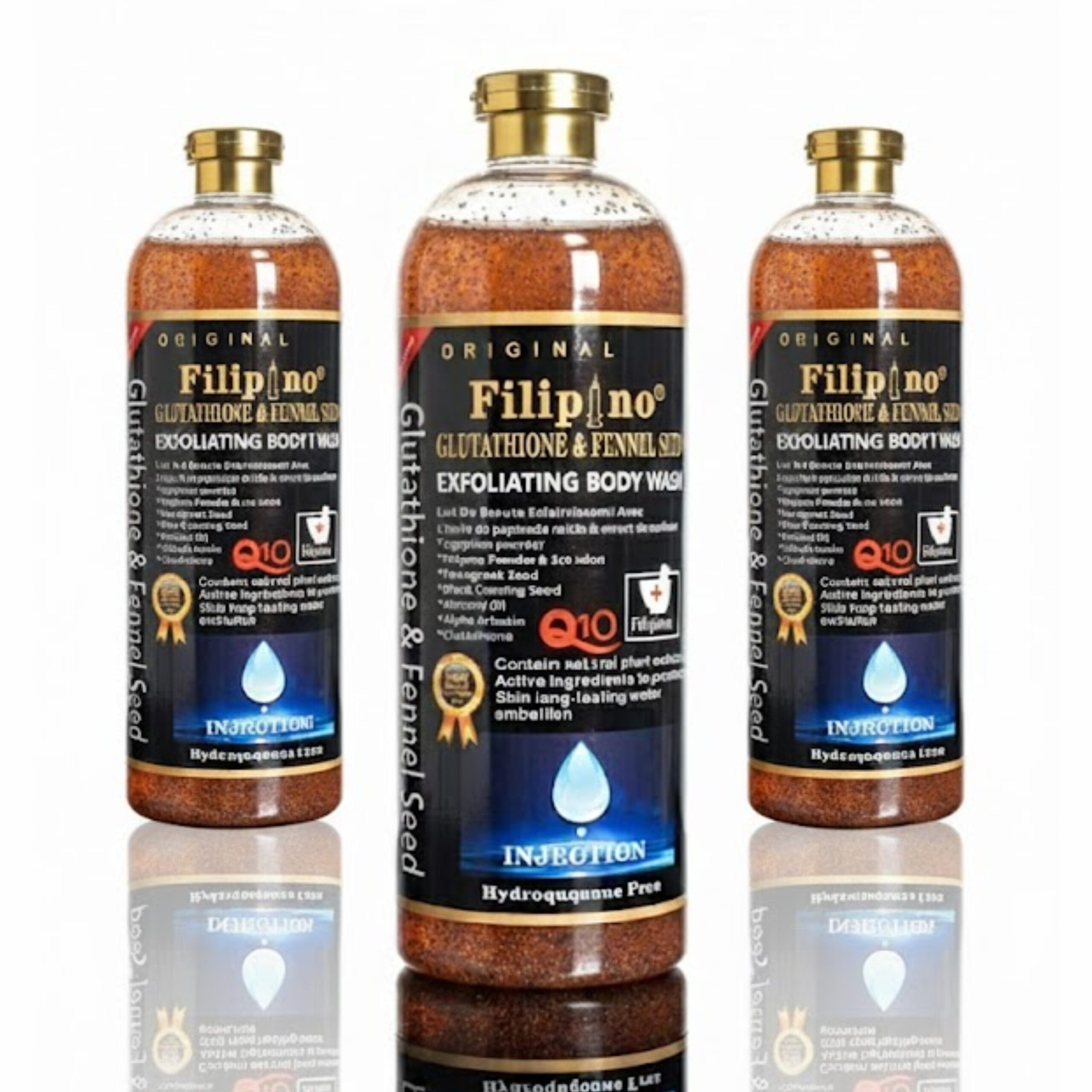 The Filipino Alpha Arbutin Exfoliating Body Wash is a skincare product designed to cleanse and brighten the skin using ingredients like alpha arbutin, black cumin seed, and almond oil.