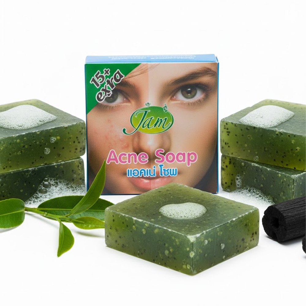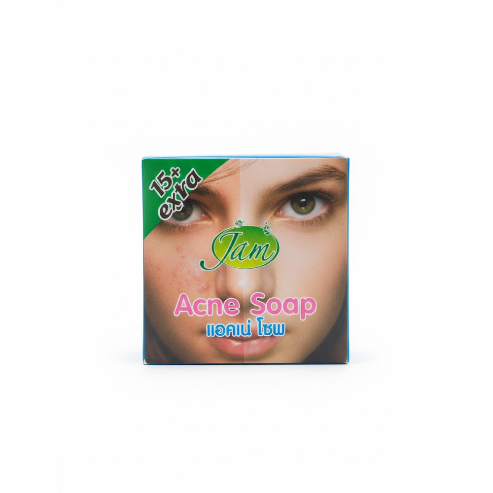 Jam Acne Soap is a herbal cleansing bar from Thailand designed to treat acne, clear blemishes, and fade dark spots on both the face and body. Formulated with natural extracts, it targets acne-causing bacteria and excess oil while promoting a smoother, brighter complexion.