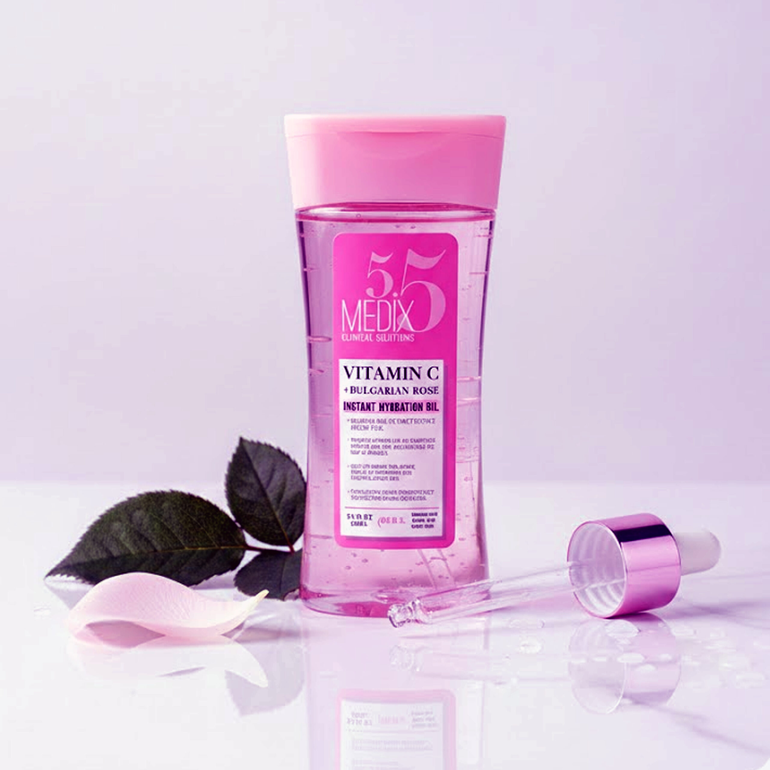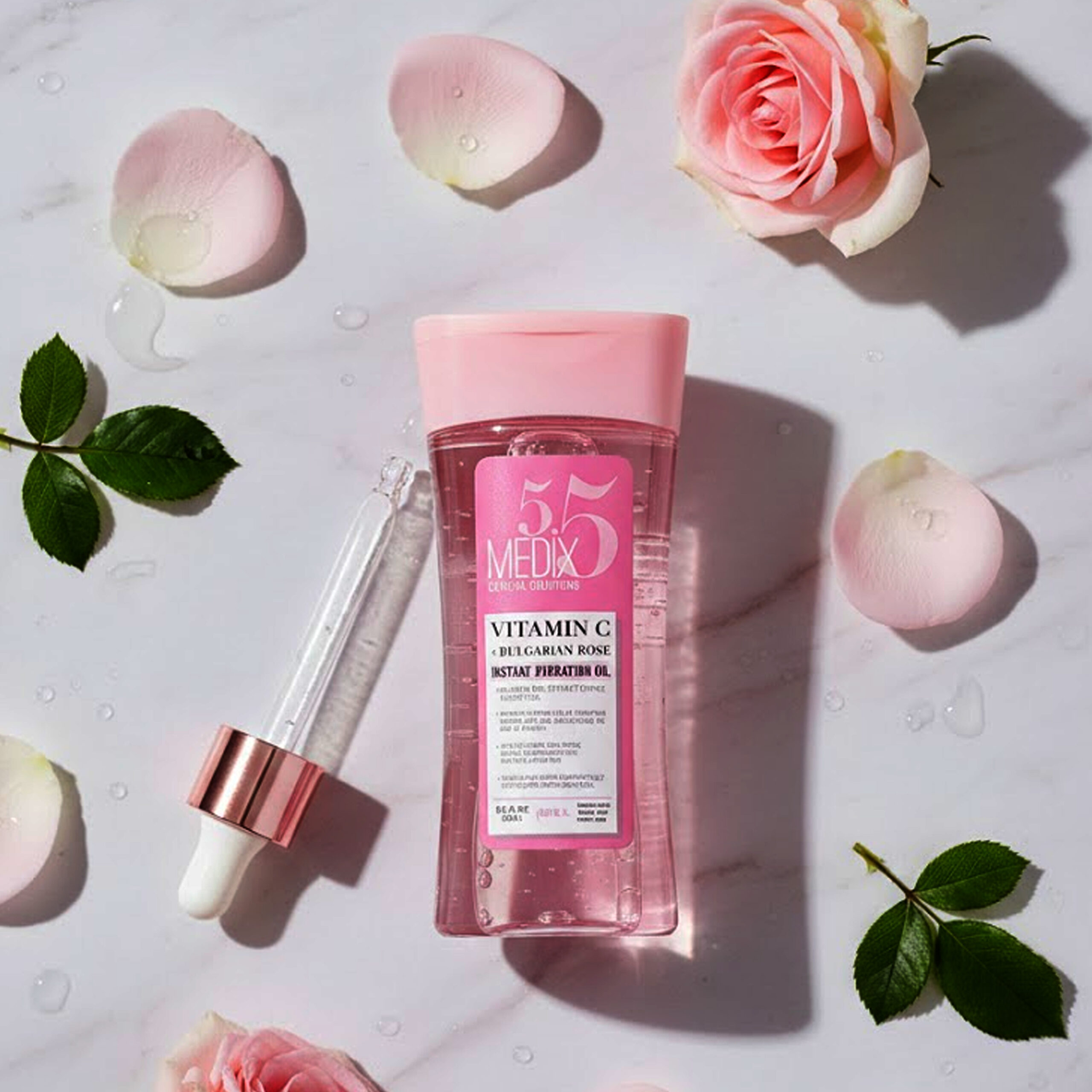 The product in the image is the Medix 5.5 Vitamin C + Bulgarian Rose Instant Hydration Oil. This body oil is designed to deeply hydrate, brighten, and soften the skin, promoting a more even and radiant complexion.