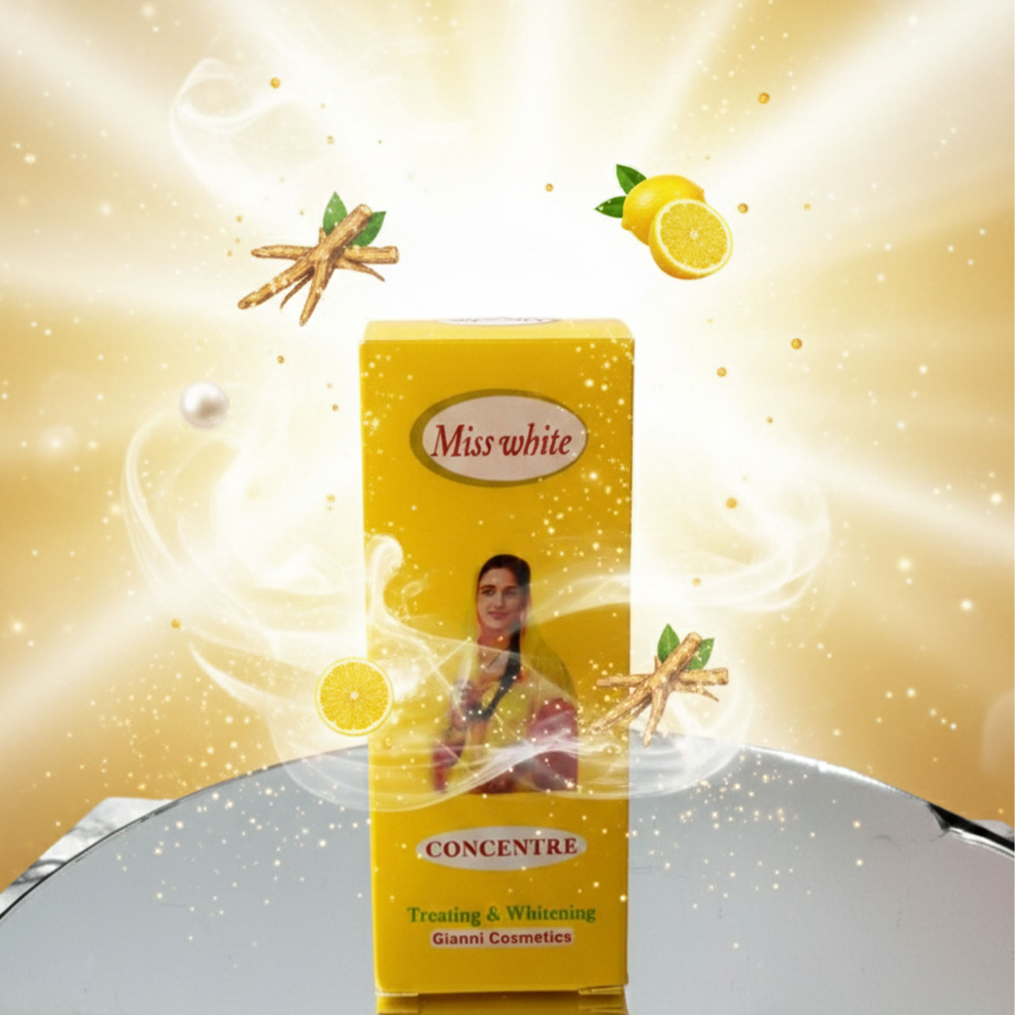 Miss White Concentre (Concentrate) is a “Treating & Whitening” cosmetic product by Gianni Cosmetics, which appears to be related to the larger “Fair & White” skincare brand. It is a brightening serum or oil designed to target hyperpigmentation and even out skin tone.