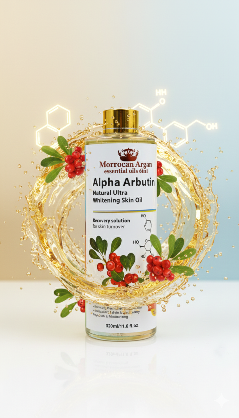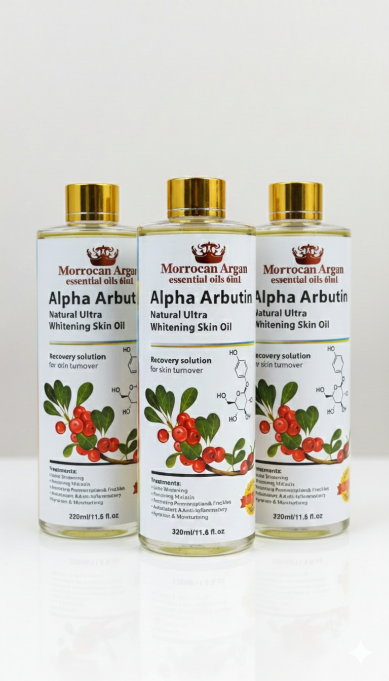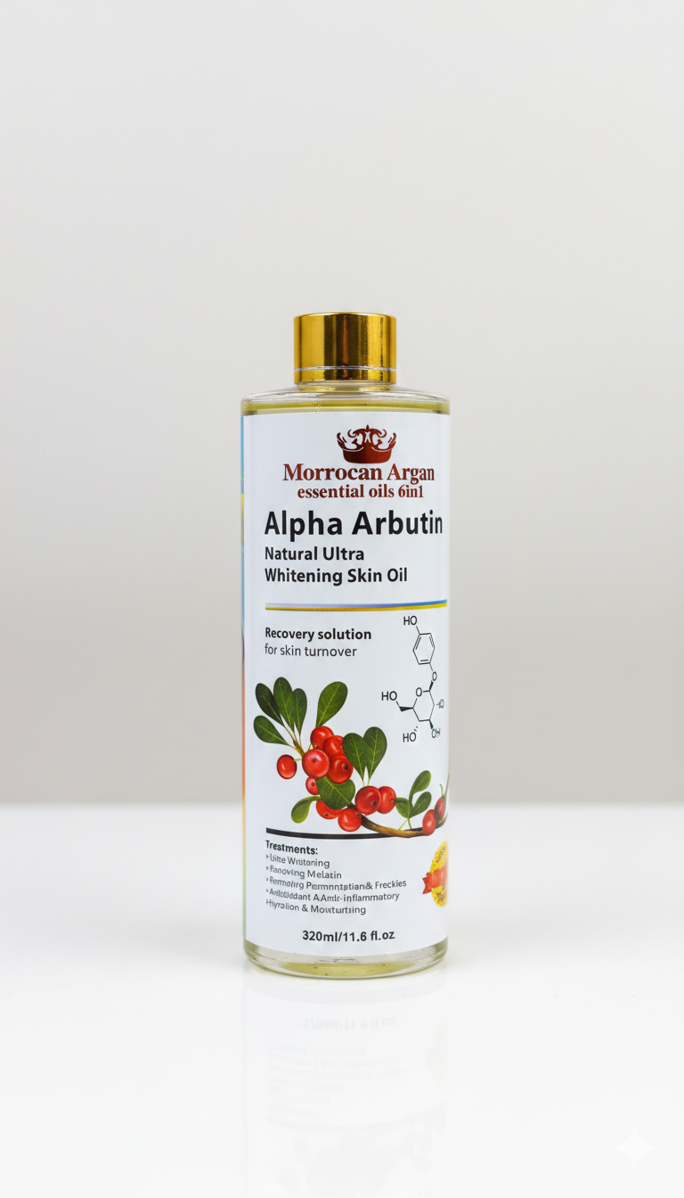 Moroccan Argan Essential Oils 6-in-1 Alpha Arbutin Natural Ultra Whitening Skin Oil is a body and face oil designed to brighten and even out skin tone.
