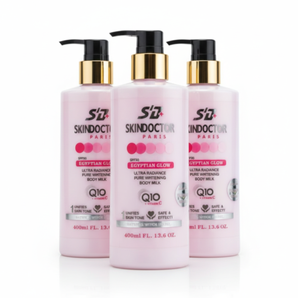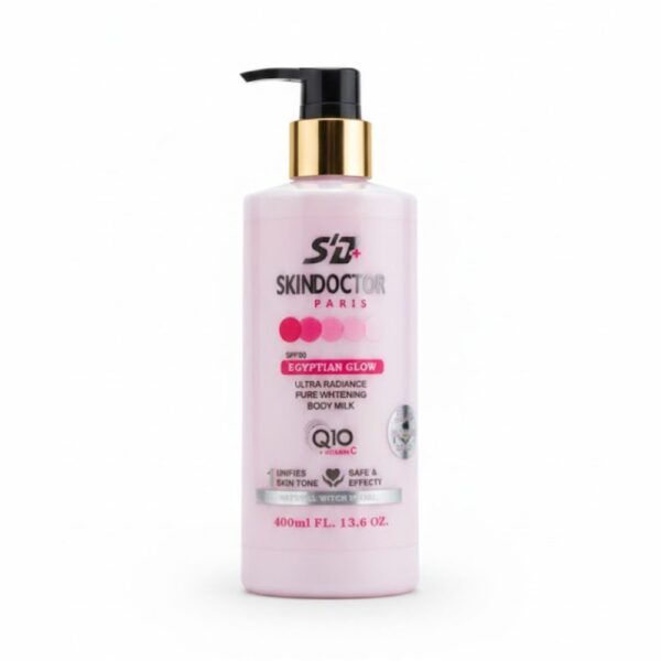Skin Doctor Paris Egyptian Glow Ultra Radiance Pure Whitening Body Milk, a 400ml lotion formulated to brighten skin and even out its tone. It contains Q10, Vitamin C, and SPF 30 for sun protection.