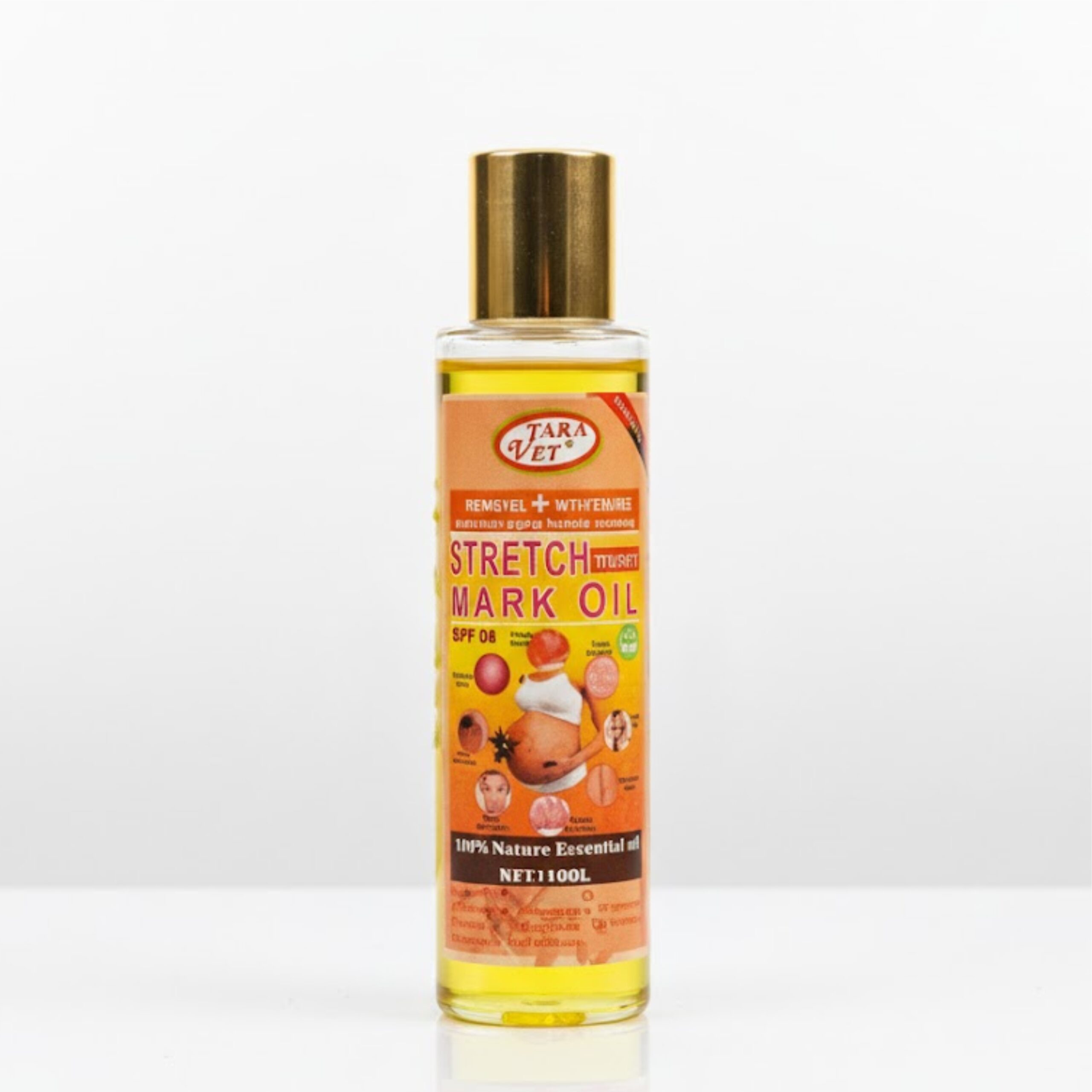 Tara Vet Stretch Mark Oil, a skincare product designed to improve the appearance of stretch marks, scars, and uneven skin tone. It is described as being made with natural essential oils and is available from several online retailers.
