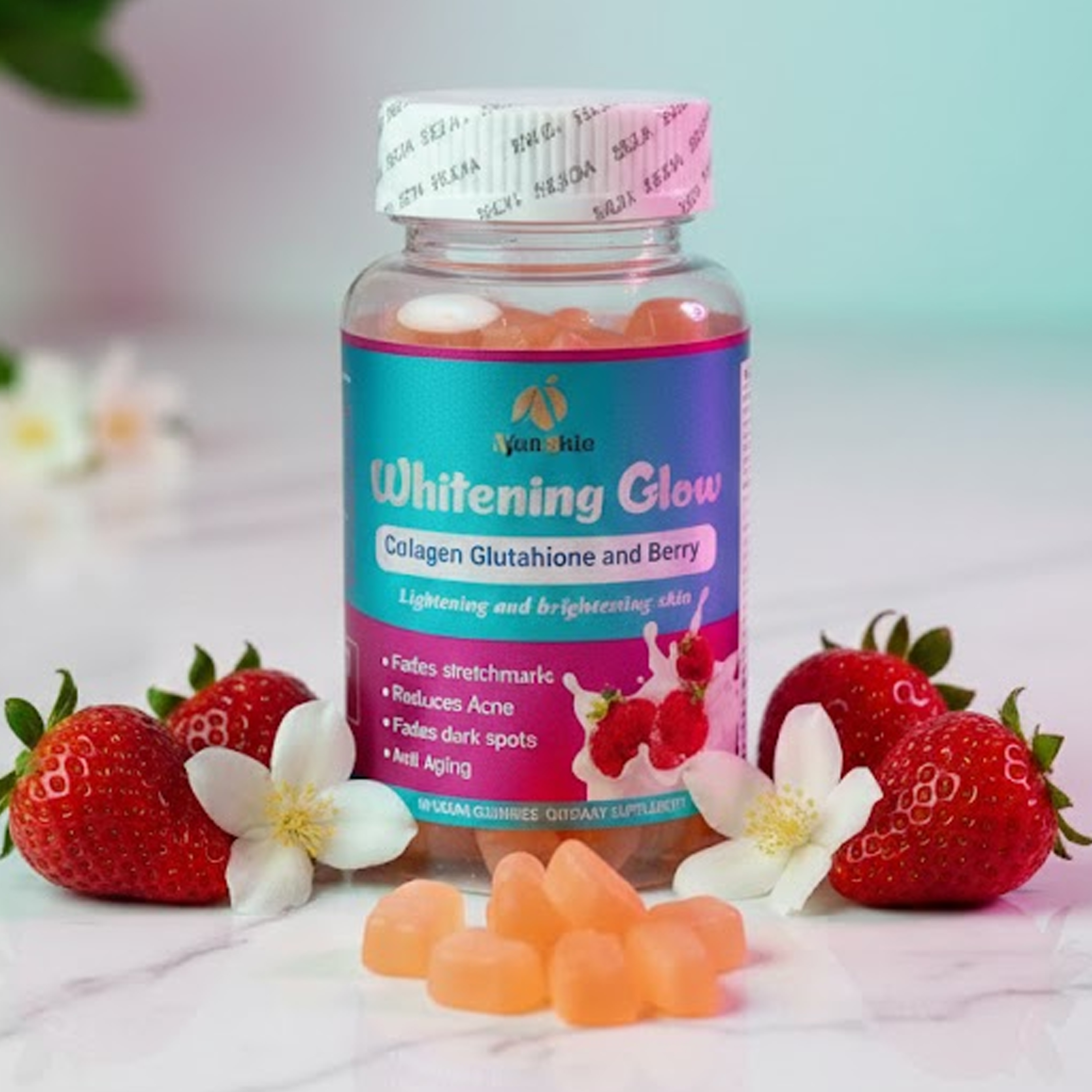 Achieve the ultimate luminous complexion with Whitening Glow Gummies, a high-performance dietary supplement designed to brighten, clear, and rejuvenate your skin from the inside out. These delicious, strawberry-infused vegan gummies combine powerful antioxidants with essential nutrients to target common skin concerns and promote a “whitening glow”.